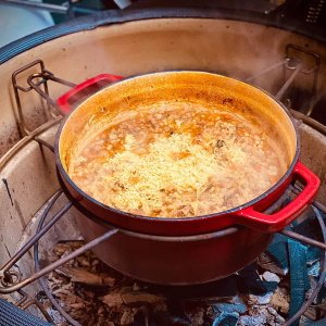 - Paruoškite Kamado BONO kepsninę tiesioginiam kepimui, uždekite anglis. Įstatykite į laikiklį Grand feu puodą. Palaukite, kol puode gerai įkais aliejus.